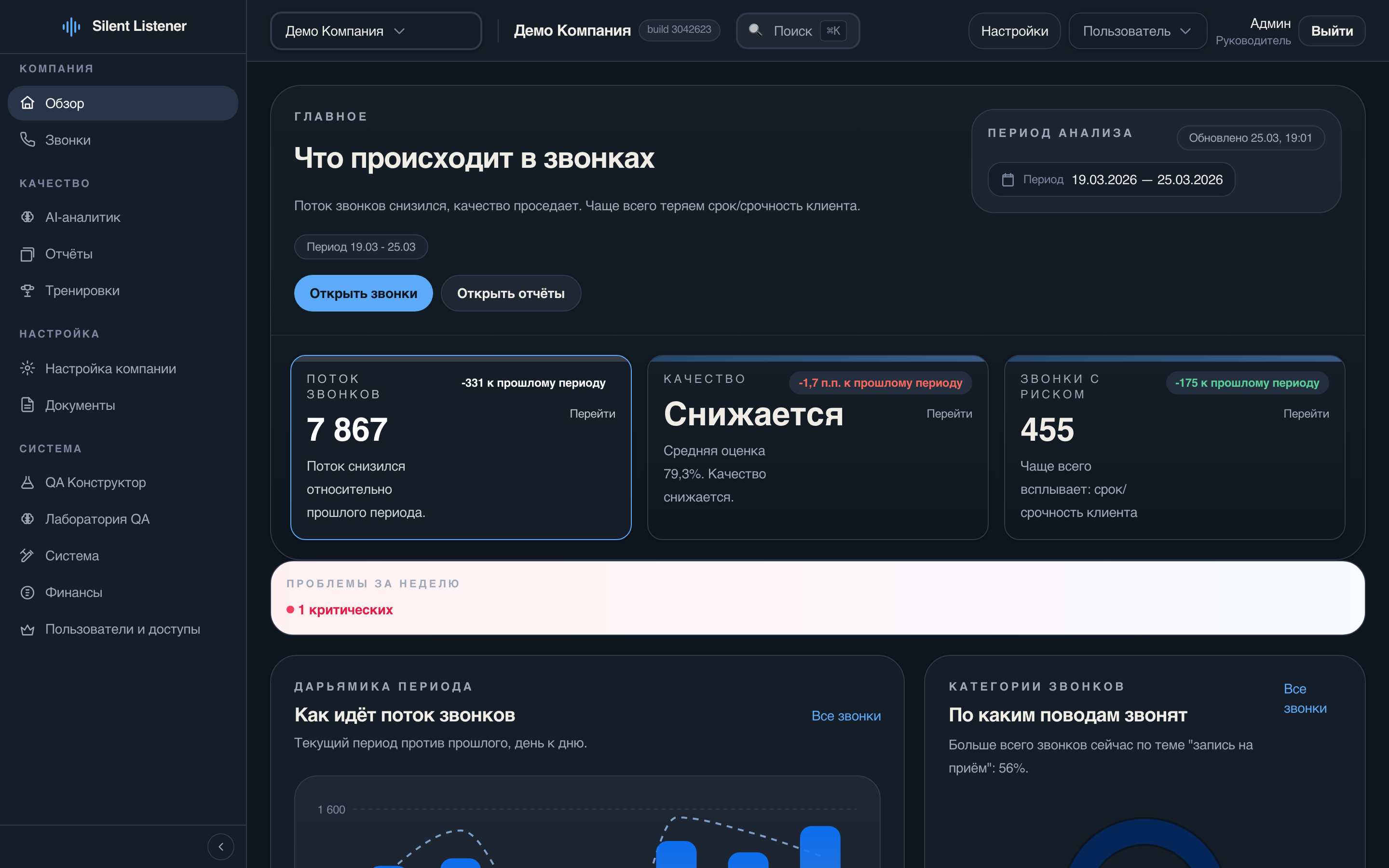 Дашборд с KPI: поток звонков, средний балл QA, звонки с риском. Тренды по дням и неделям.